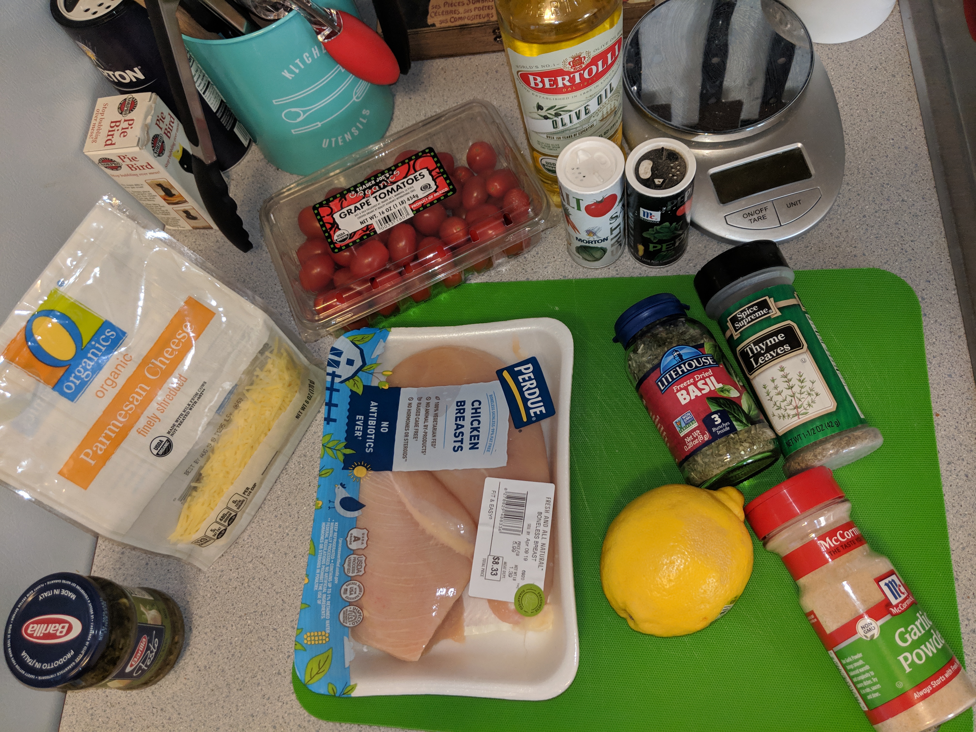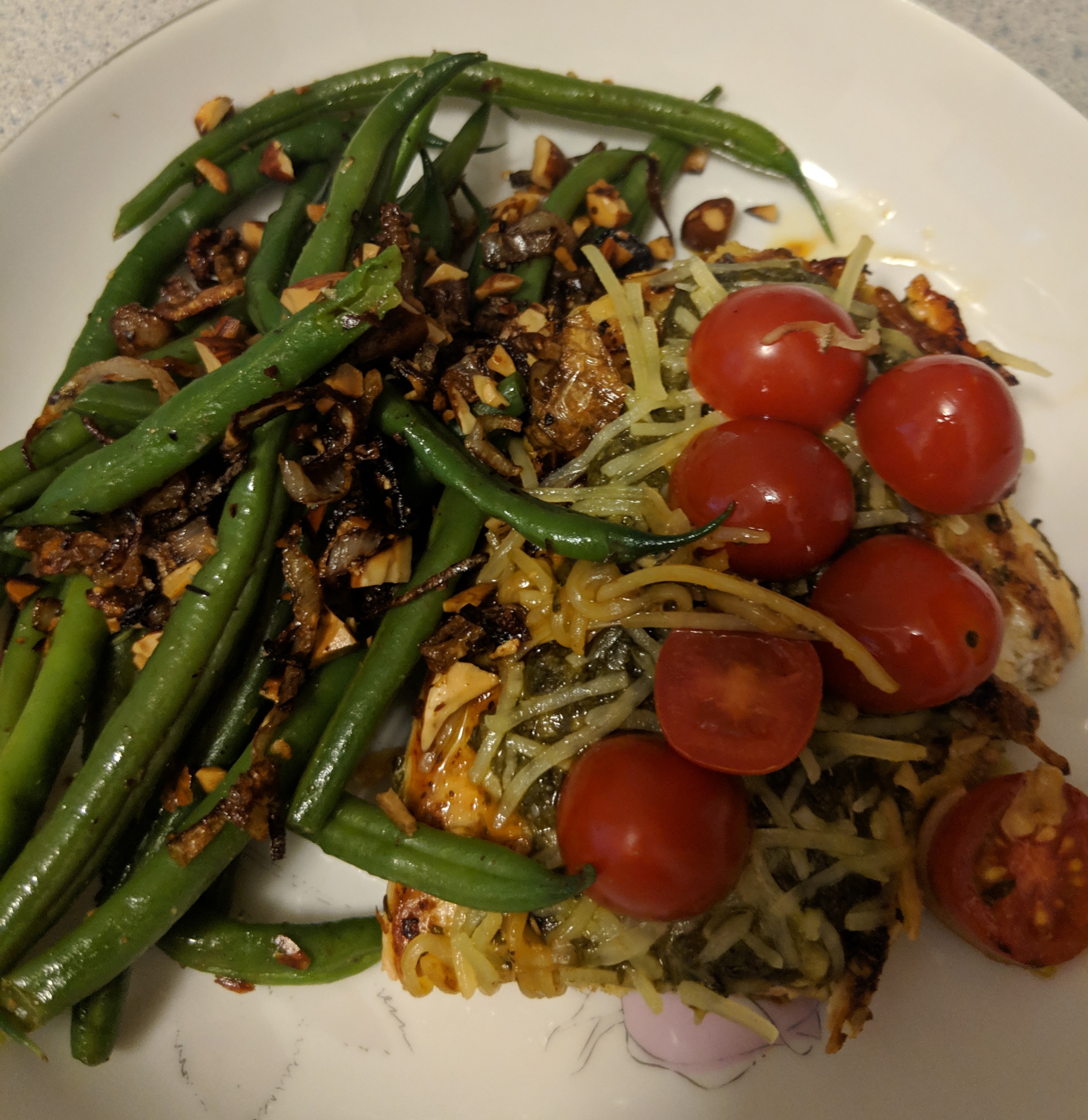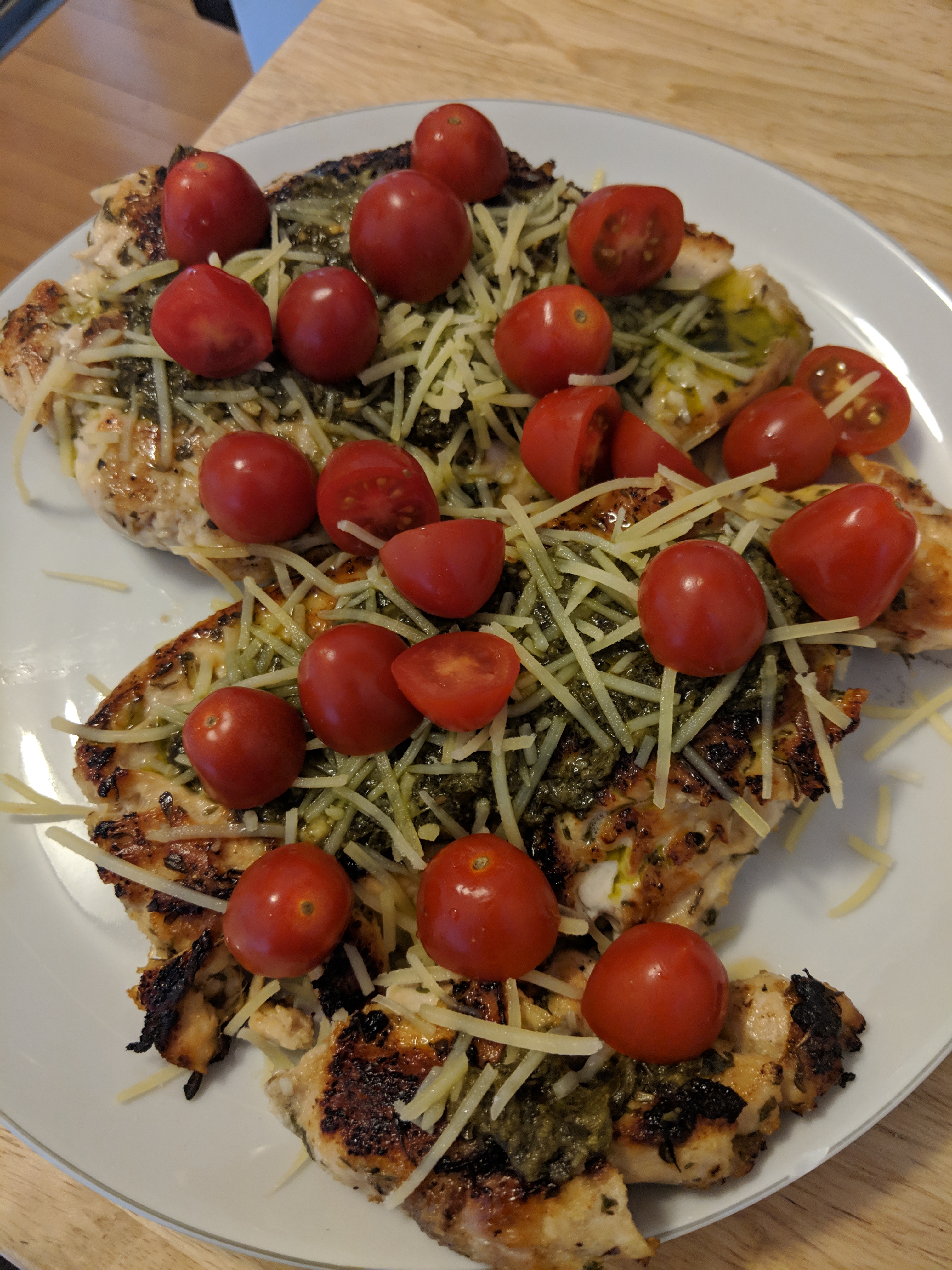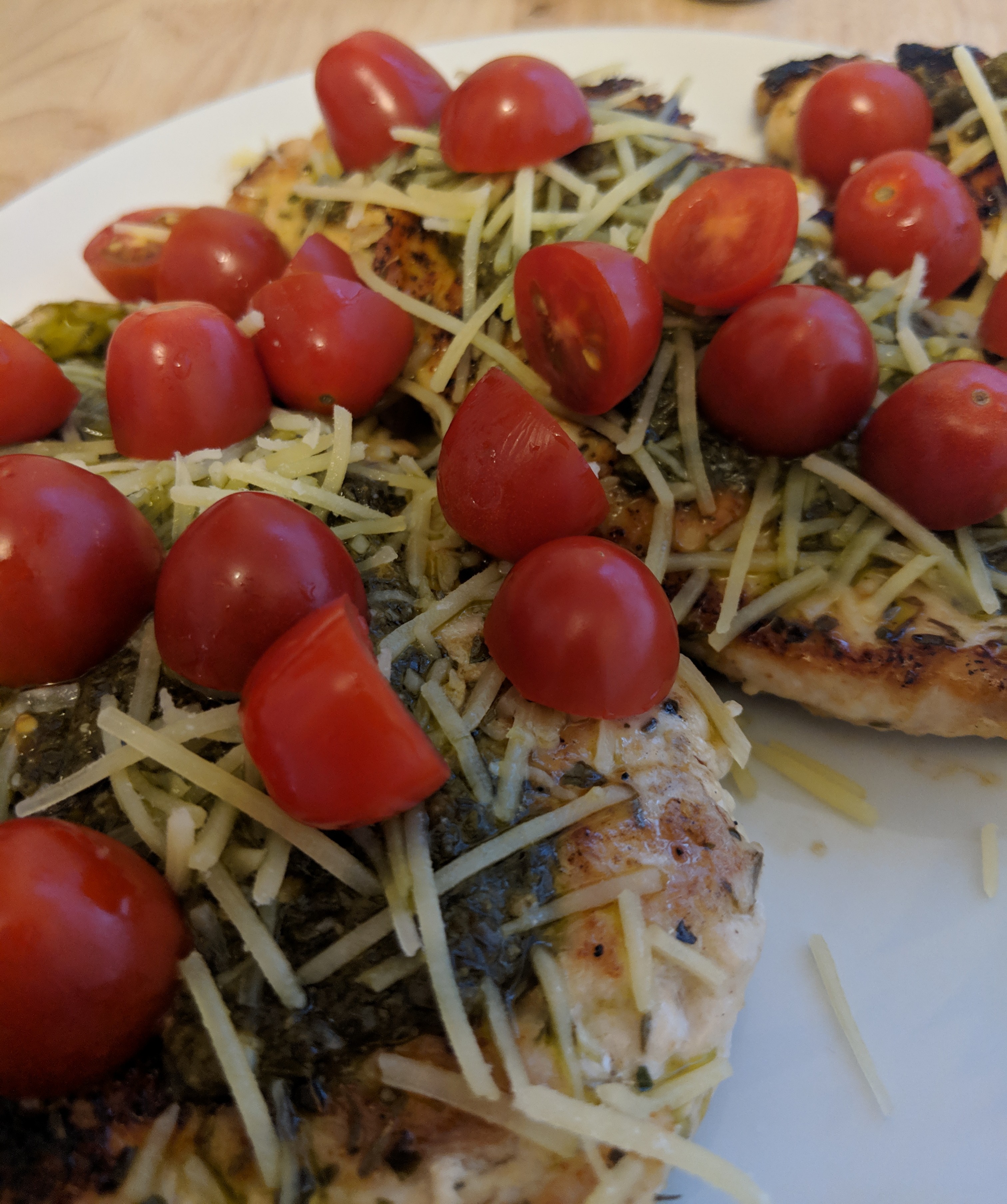 Then all you need to do is spoon about 1 tbsp of pesto on each, and split the cheese and tomatoes between each chicken breast.