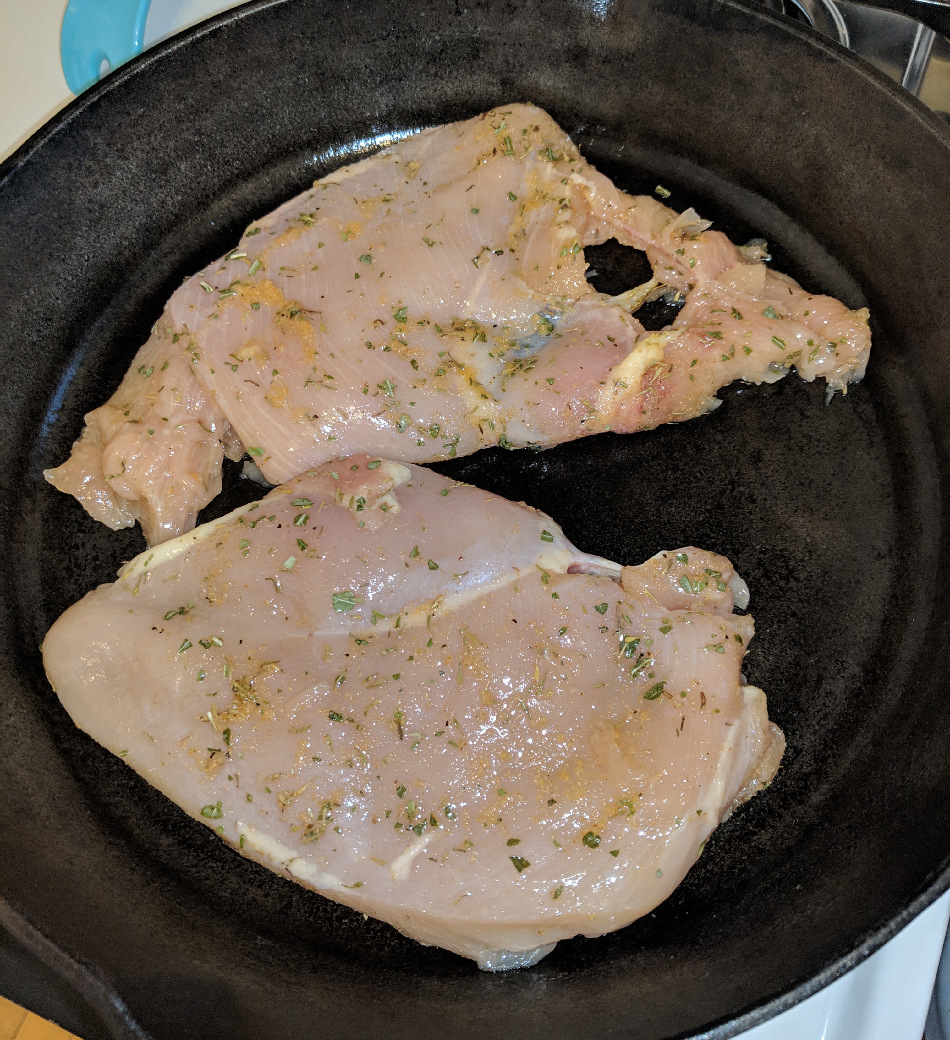 Next combine the olive oil, salt/pepper, thyme, basil, garlic powder, and lemon juice (which is optional depending on whether you like lemony chicken) and rub it all over the chicken, then place chicken into a 10 or 12 inch frying pan. I used a 12 inch cast iron.