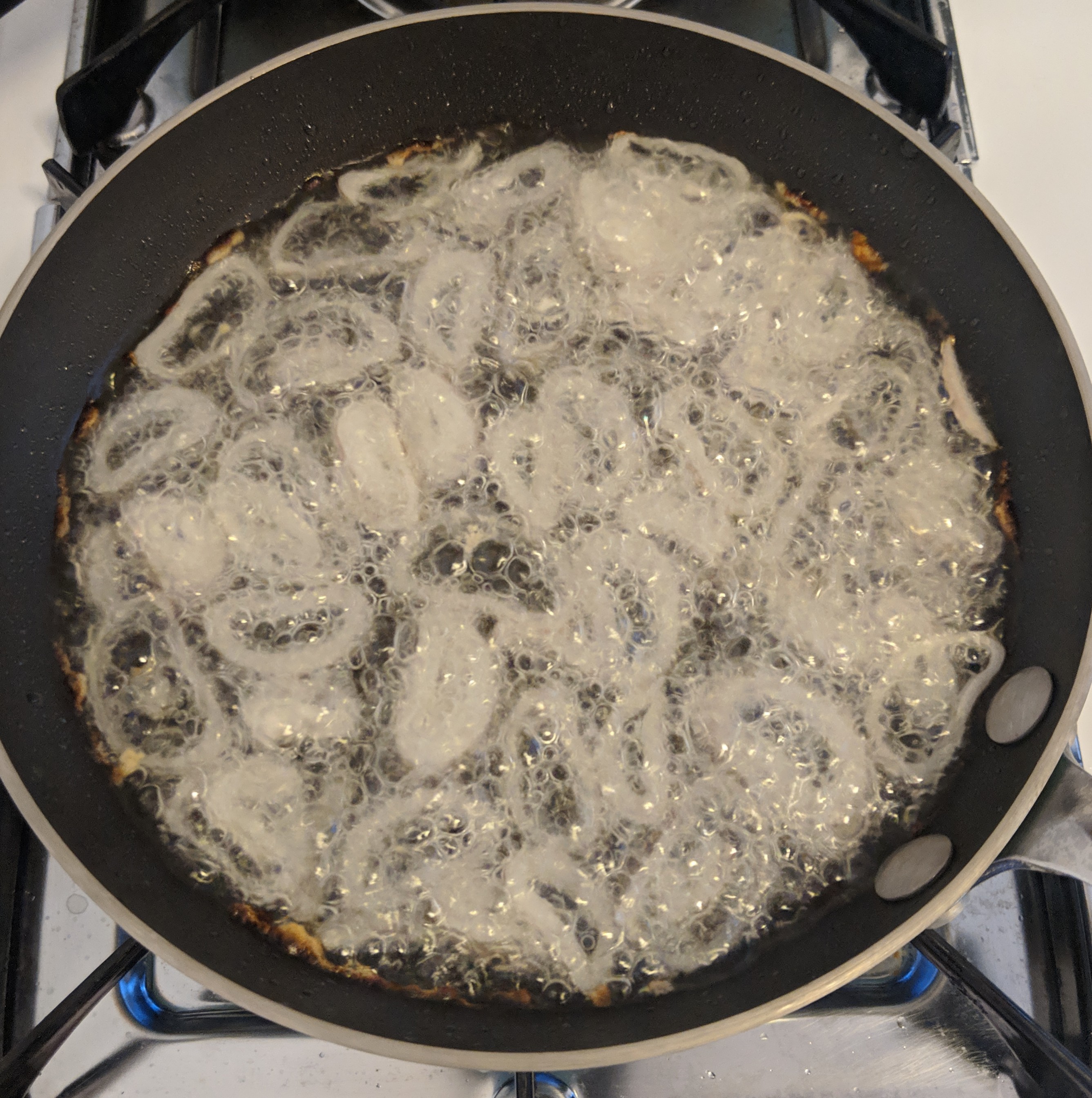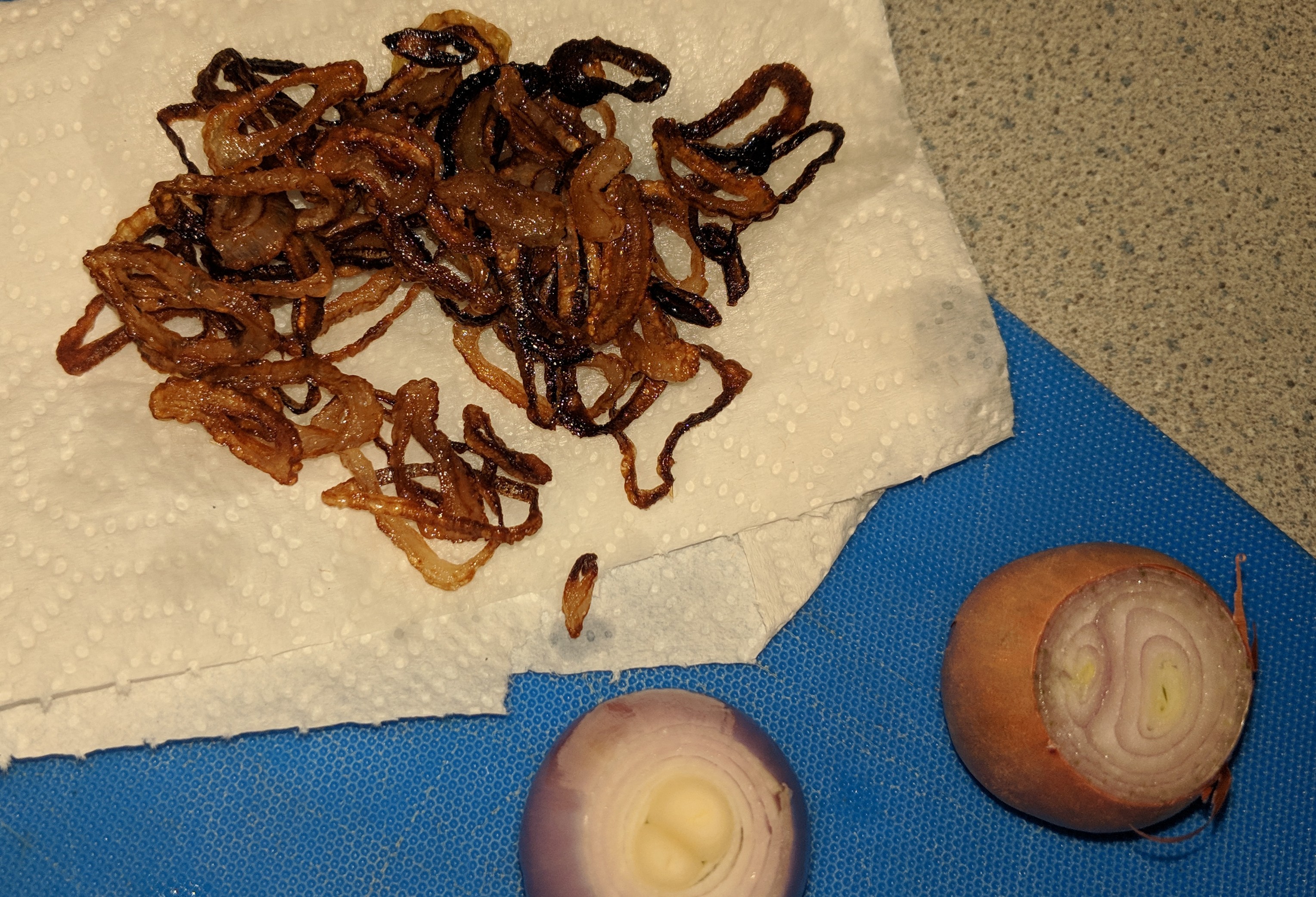 Finally, slice up your shallots and heat up the vegetable oil in a smaller pan until it’s hot enough to fry. Put in the shallots and fry them until they are cooked to your liking. This will go fast!