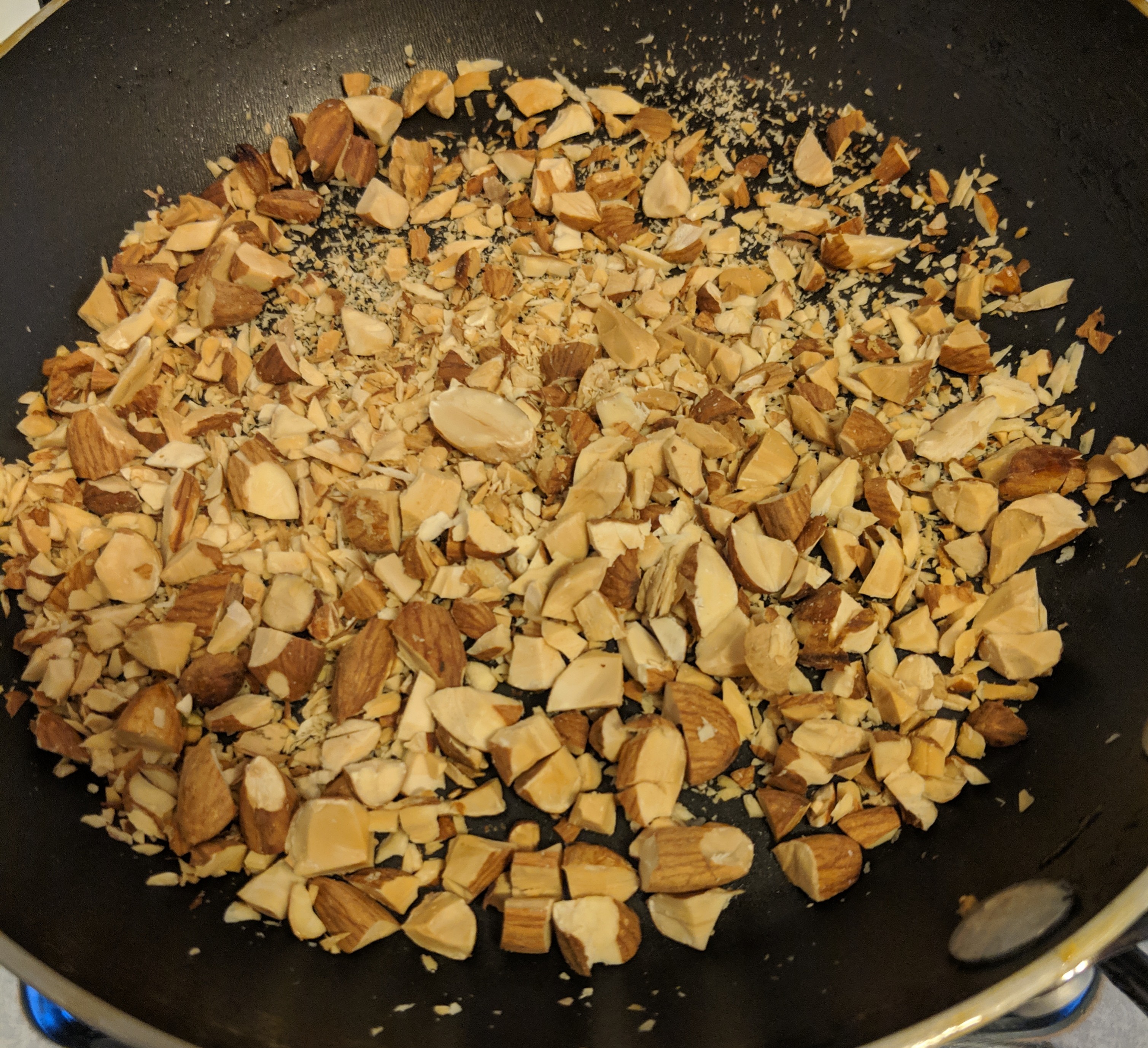 Next, chop up your almonds and put them in a pan to toast as well, for just a few minutes on med/high heat.